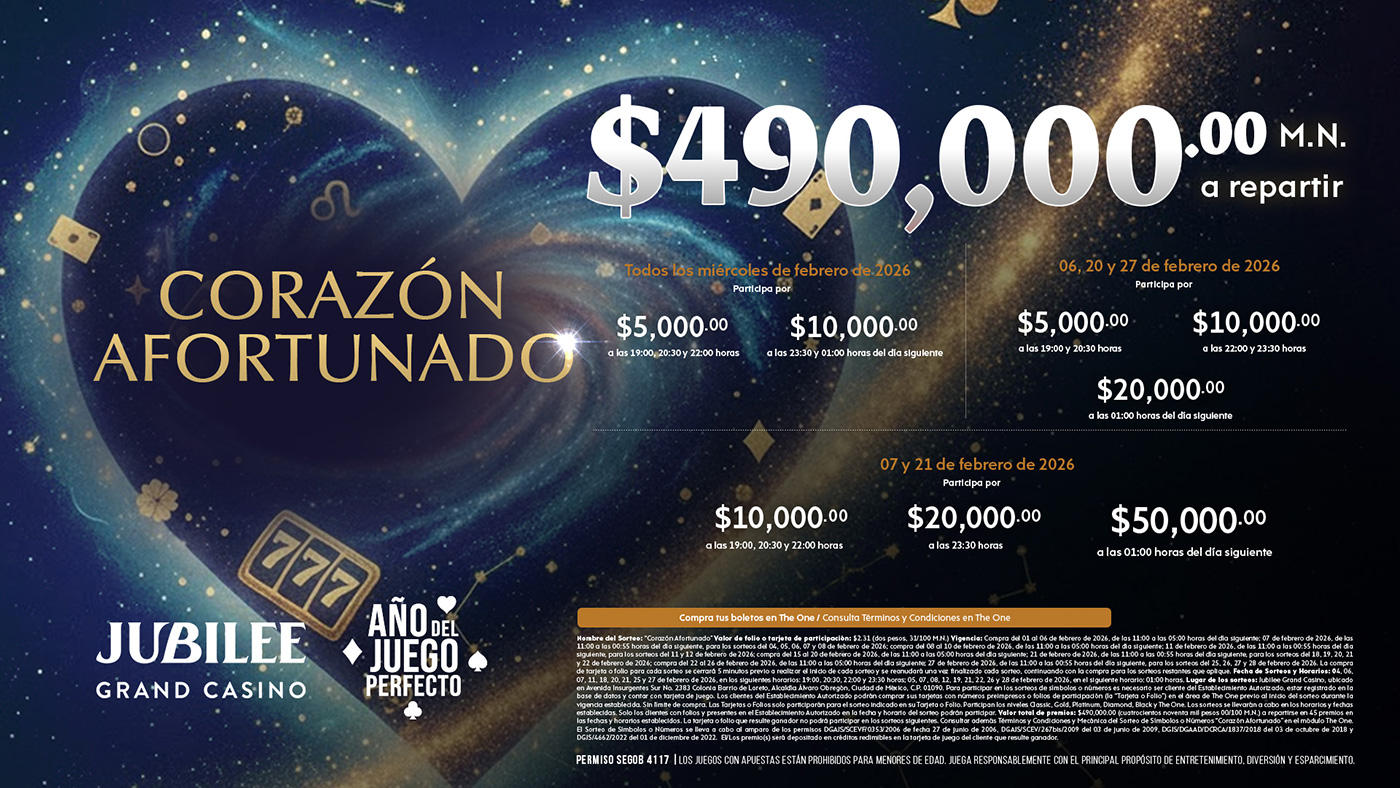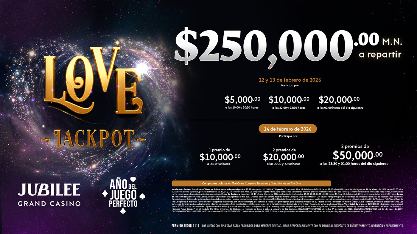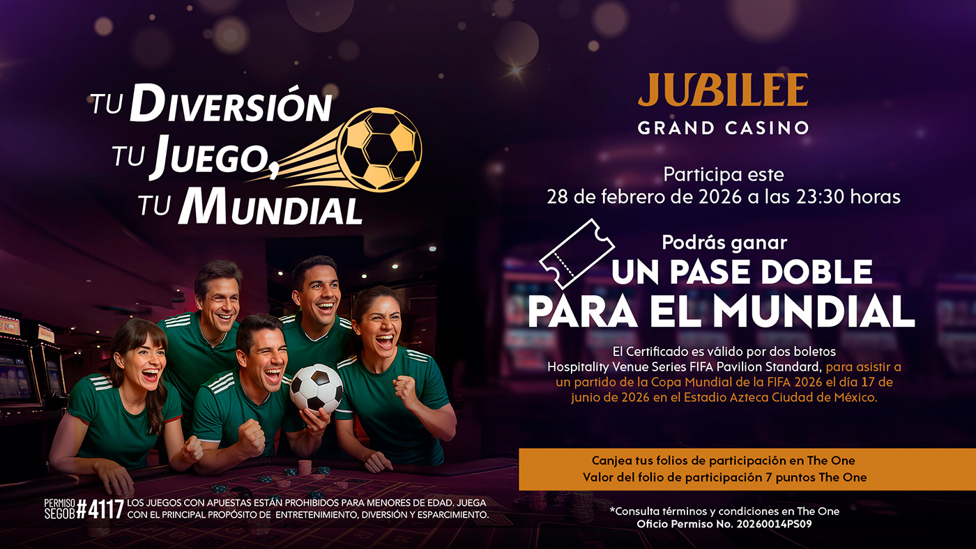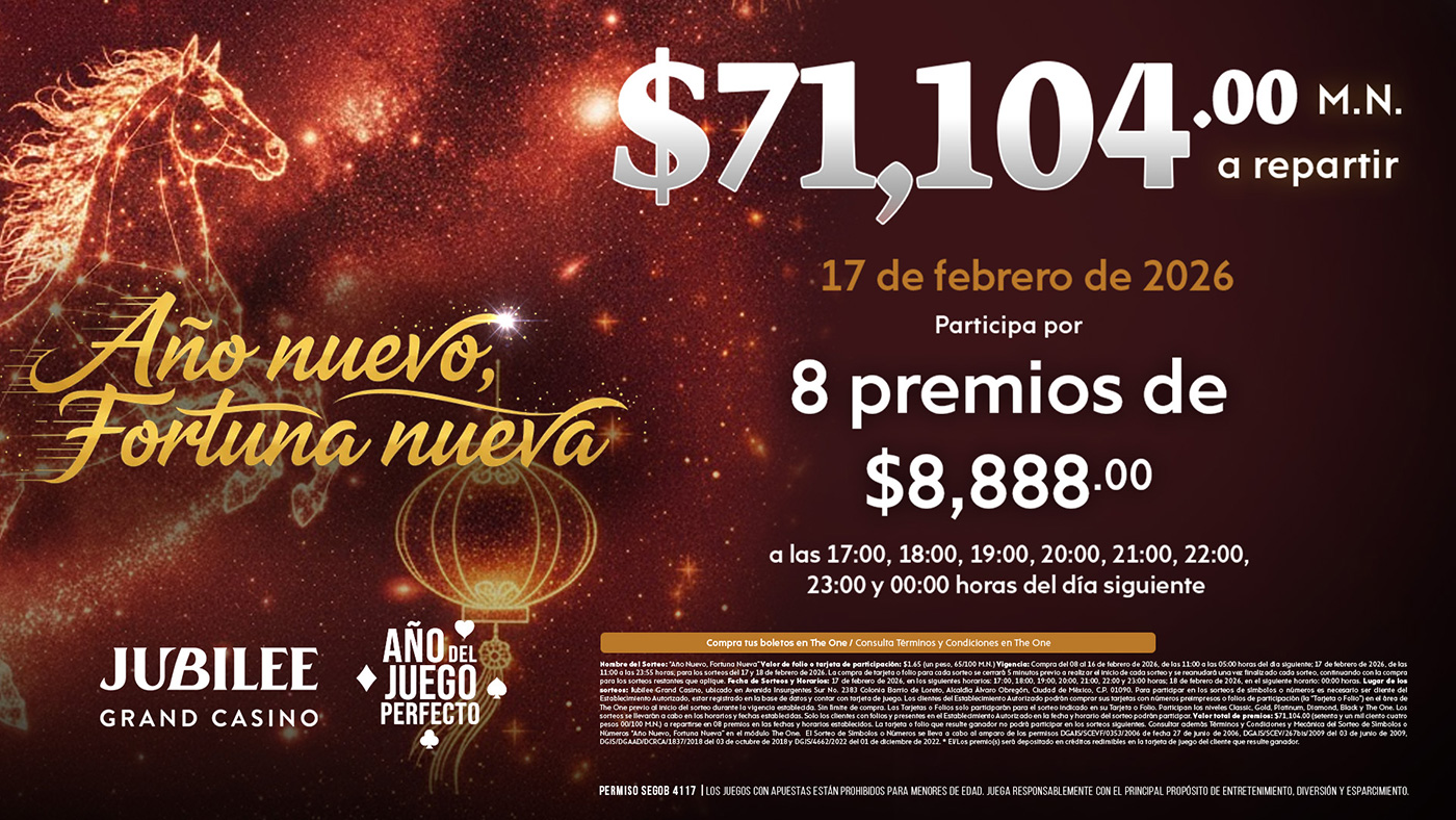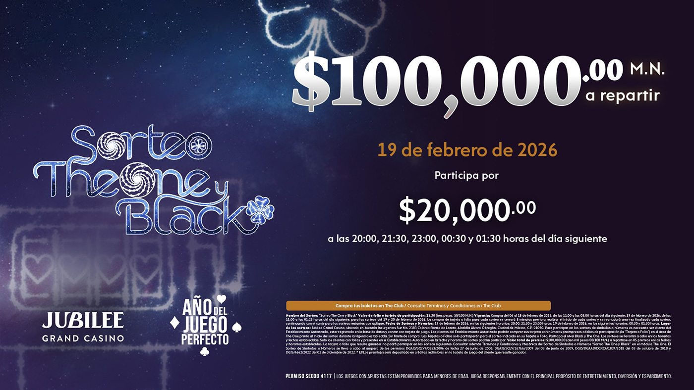 ¡Bienvenido al Jubilee Grand Casino! Siente la emoción y la diversión en nuestro exclusivo casino en el corazón de la Ciudad de México. Te esperamos con una experiencia inigualable los 7 días de la semana.