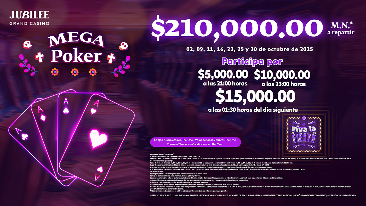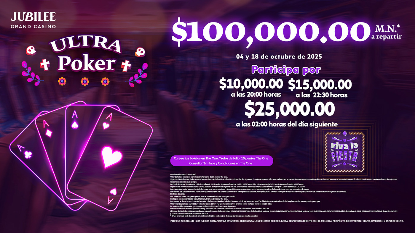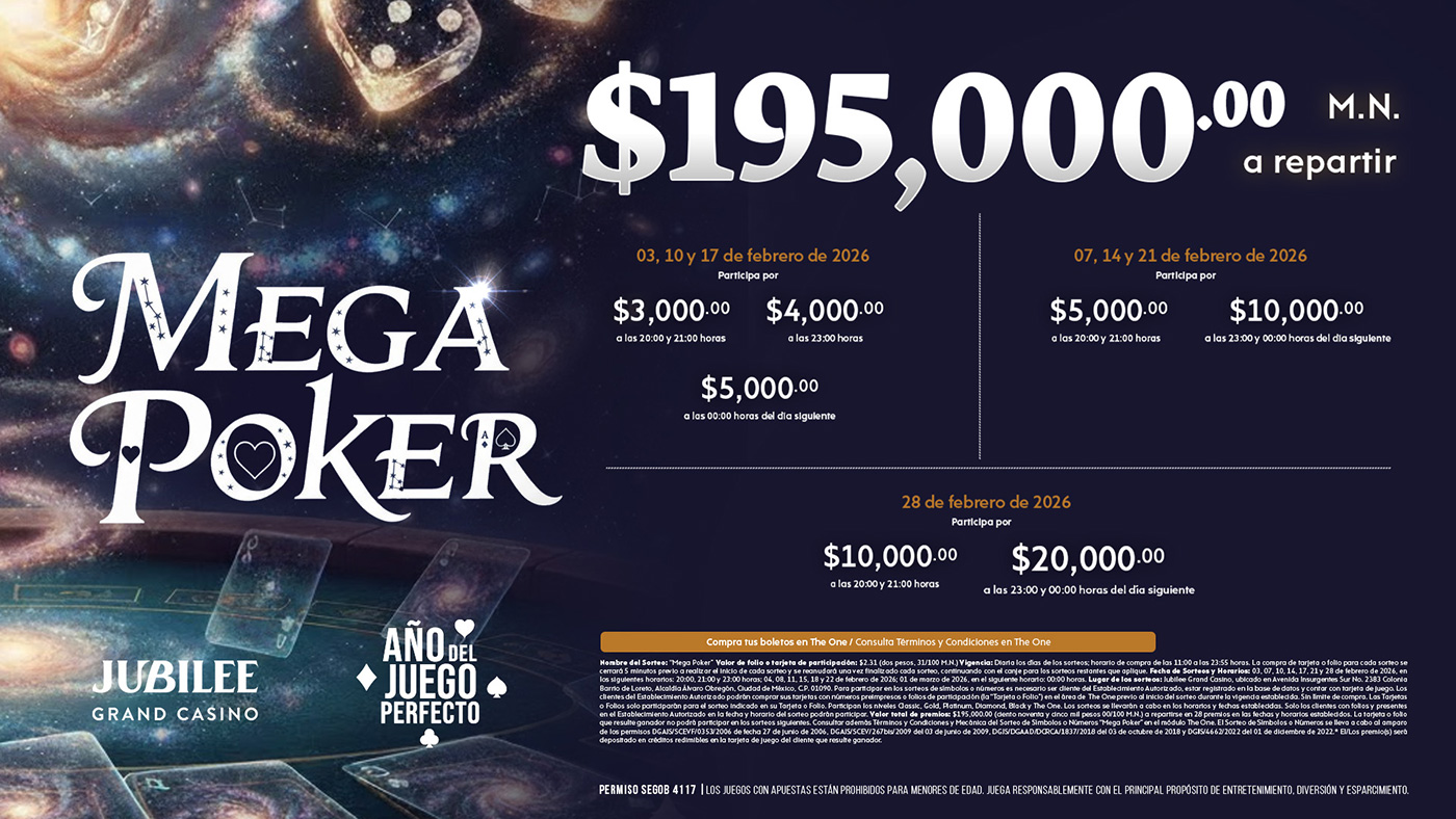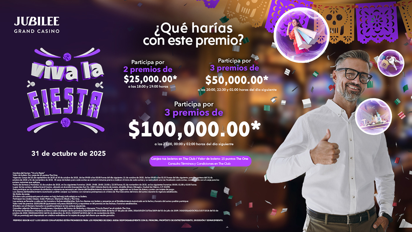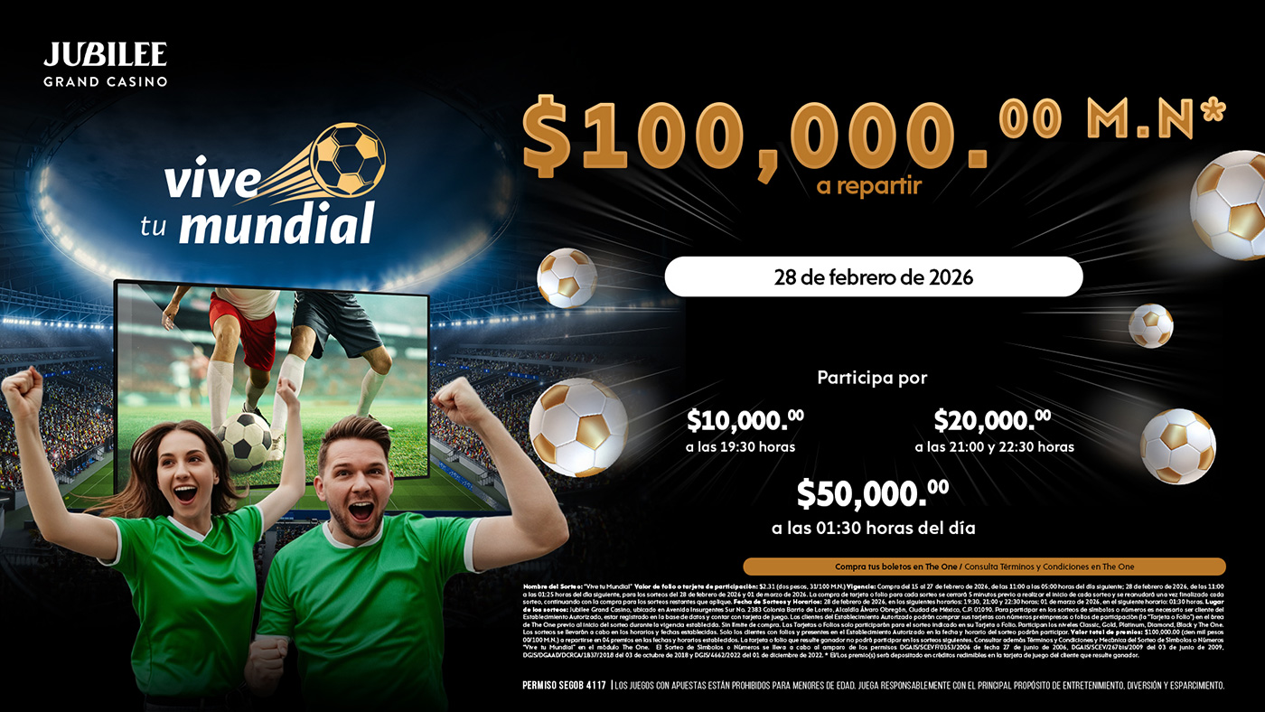 ¡Bienvenido al Jubilee Grand Casino! Siente la emoción y la diversión en nuestro exclusivo casino en el corazón de la Ciudad de México. Te esperamos con una experiencia inigualable los 7 días de la semana.
